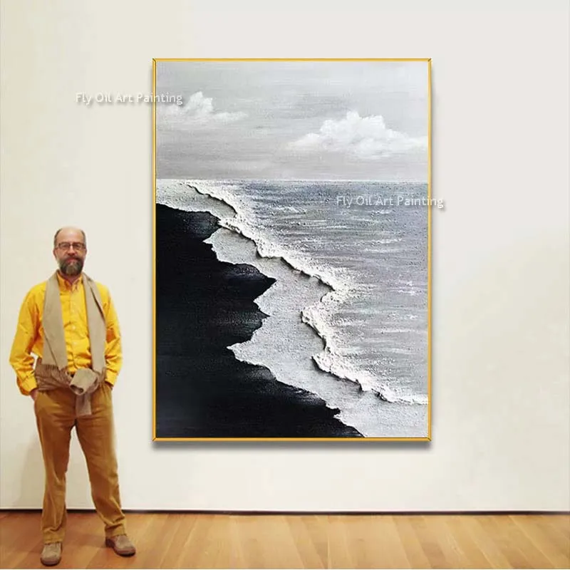 Современная Абстрактная черно-белая морская волна нож Толстая масляная живопись на холсте Абстрактная ручная роспись большое настенное искусство для домашнего декора