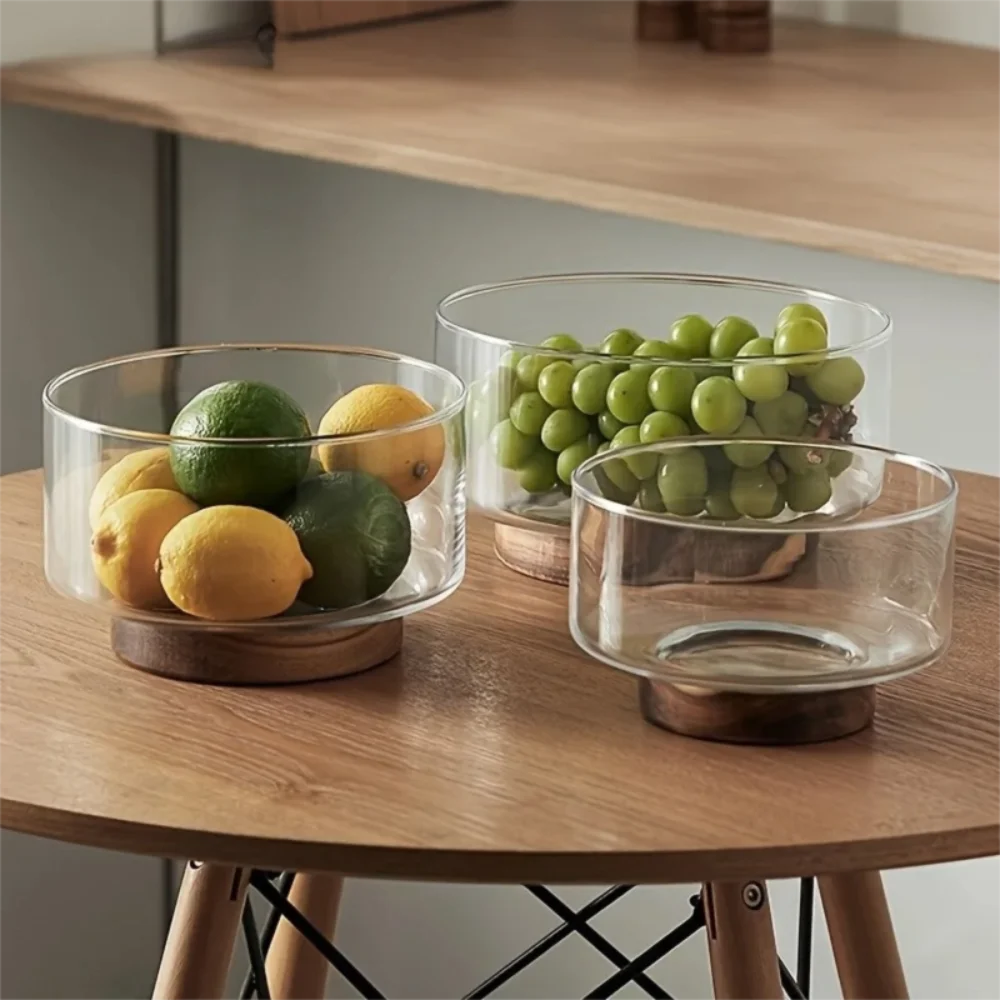 Современная большая стеклянная миска для фруктов, прозрачная стеклянная деревянная основа, салатница, кухонная миска для хранения, многофункциональная миска для хранения закусок, вечерние