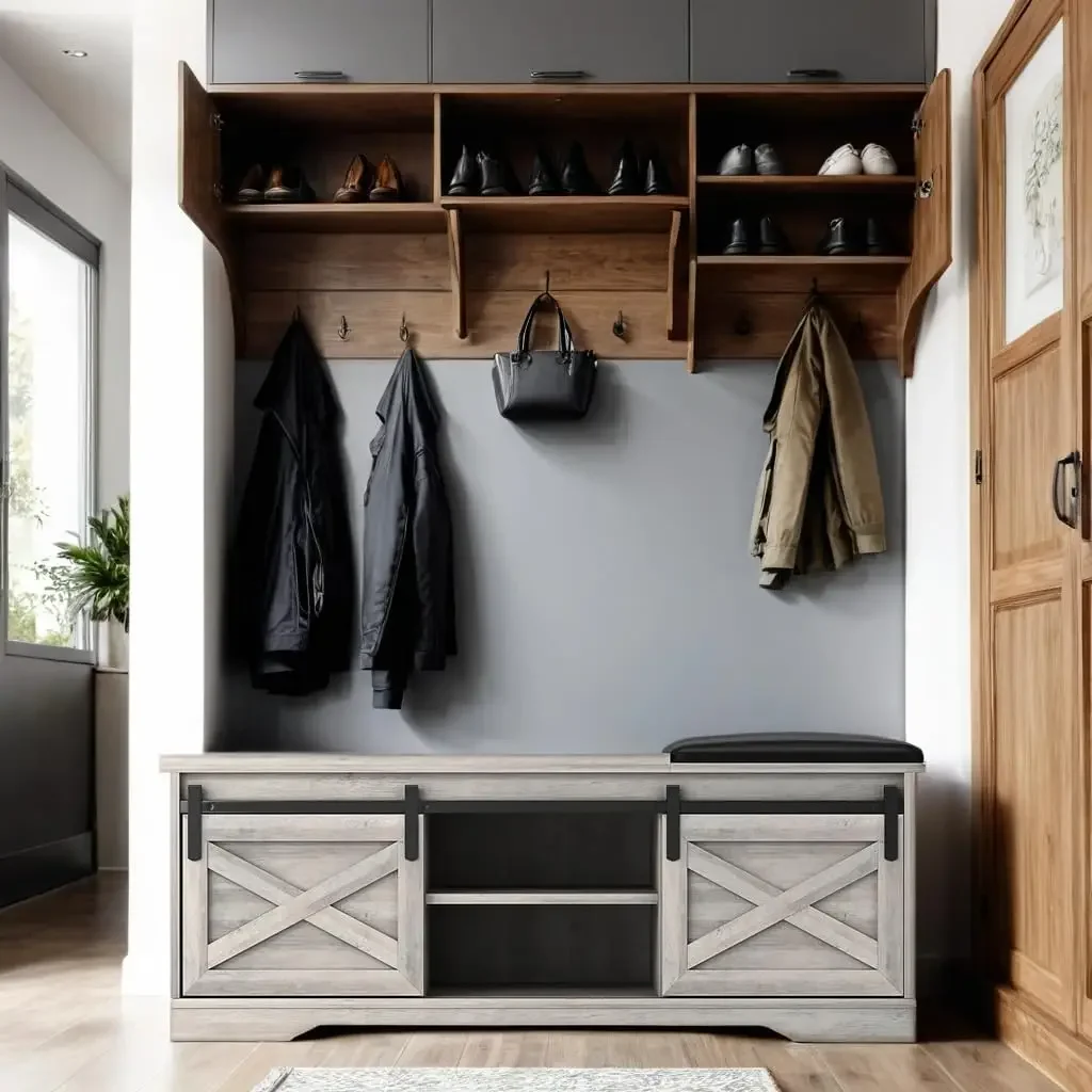 Современная скамья для обуви, скамья для прихожей в фермерском доме с местом для хранения обуви, прочная скамья для хранения со скрытым отделением для хранения обуви (серая)