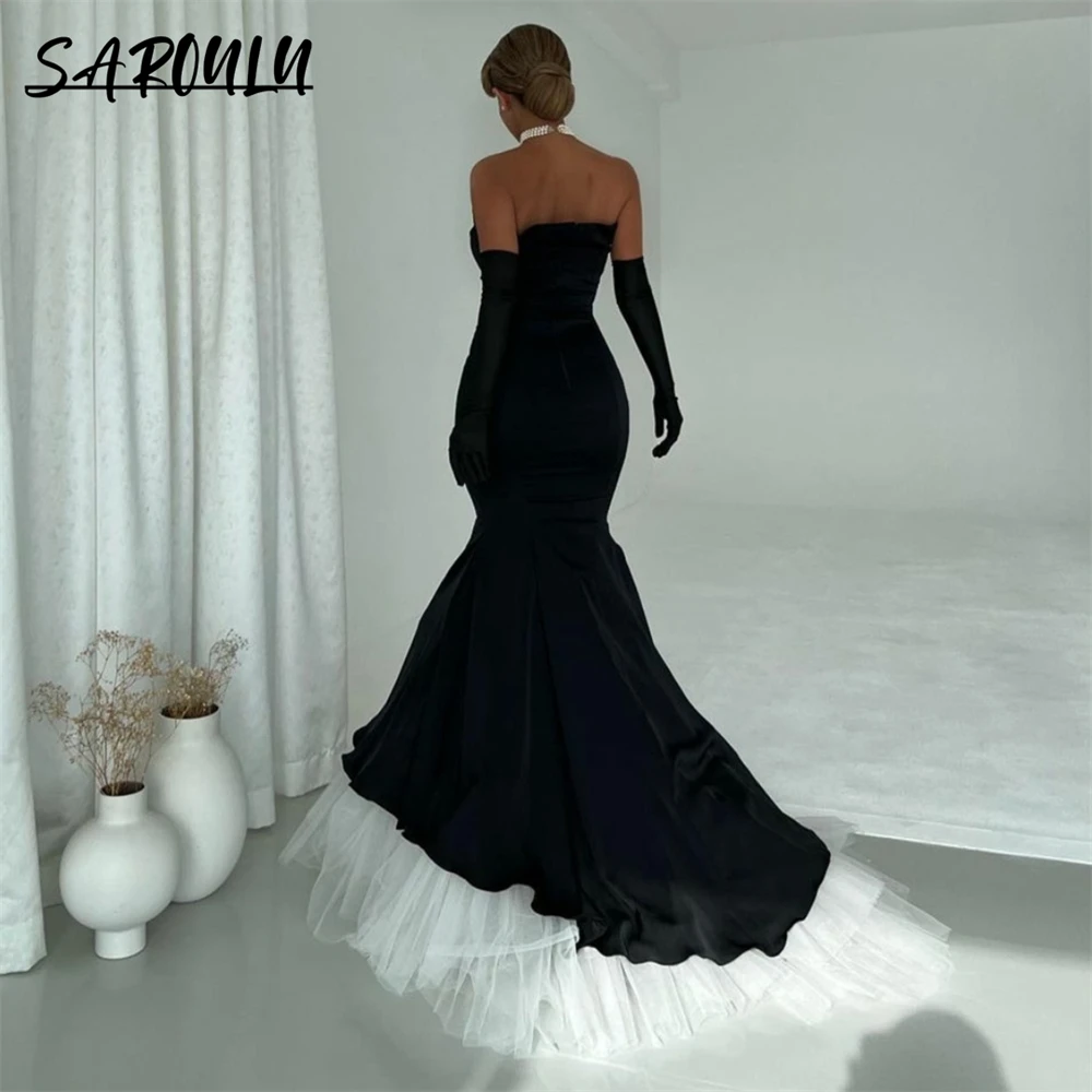 Современные атласные длинные вечерние платья без бретелек, черное Тюлевое Плиссированное официальное платье с юбкой-годе со шлейфом для женщин