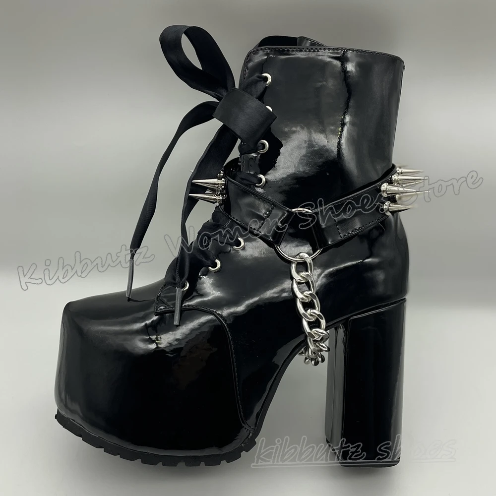 Современные ботинки до щиколотки на платформе с заклепками, металлическая цепочка, кожаная однотонная модная роскошная элегантная лаконичная пикантная женская обувь на шнуровке, новейшая