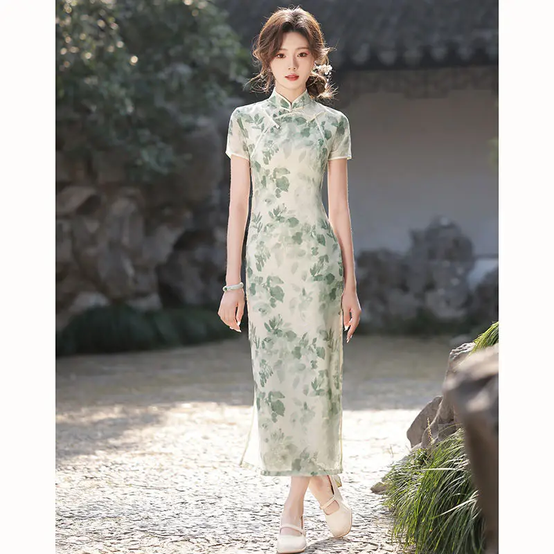 Современный молодой стиль Ципао, летнее китайское платье с цветочным принтом, облегающее длинное платье Cheongsam, модное китайское платье, этническая одежда