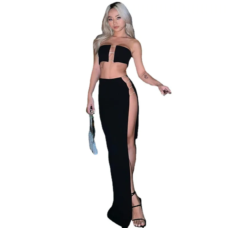 Sexy Women Two Piece Skirt Sets Party Maxi Dresses Crop Strapless Y2K Streetwear Top 2 Pieces Clothing Outfit Split Long Dress