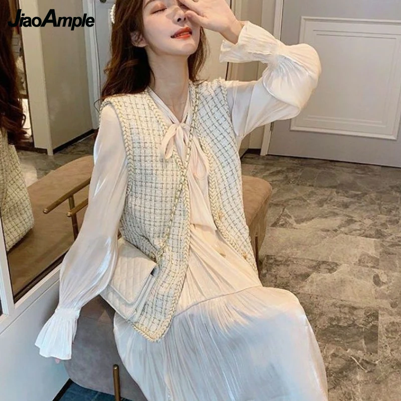 Женский твидовый жилет, платье с бантом на воротнике и расклешенными рукавами, изящный комплект из двух предметов в Корейском стиле, весна-о...