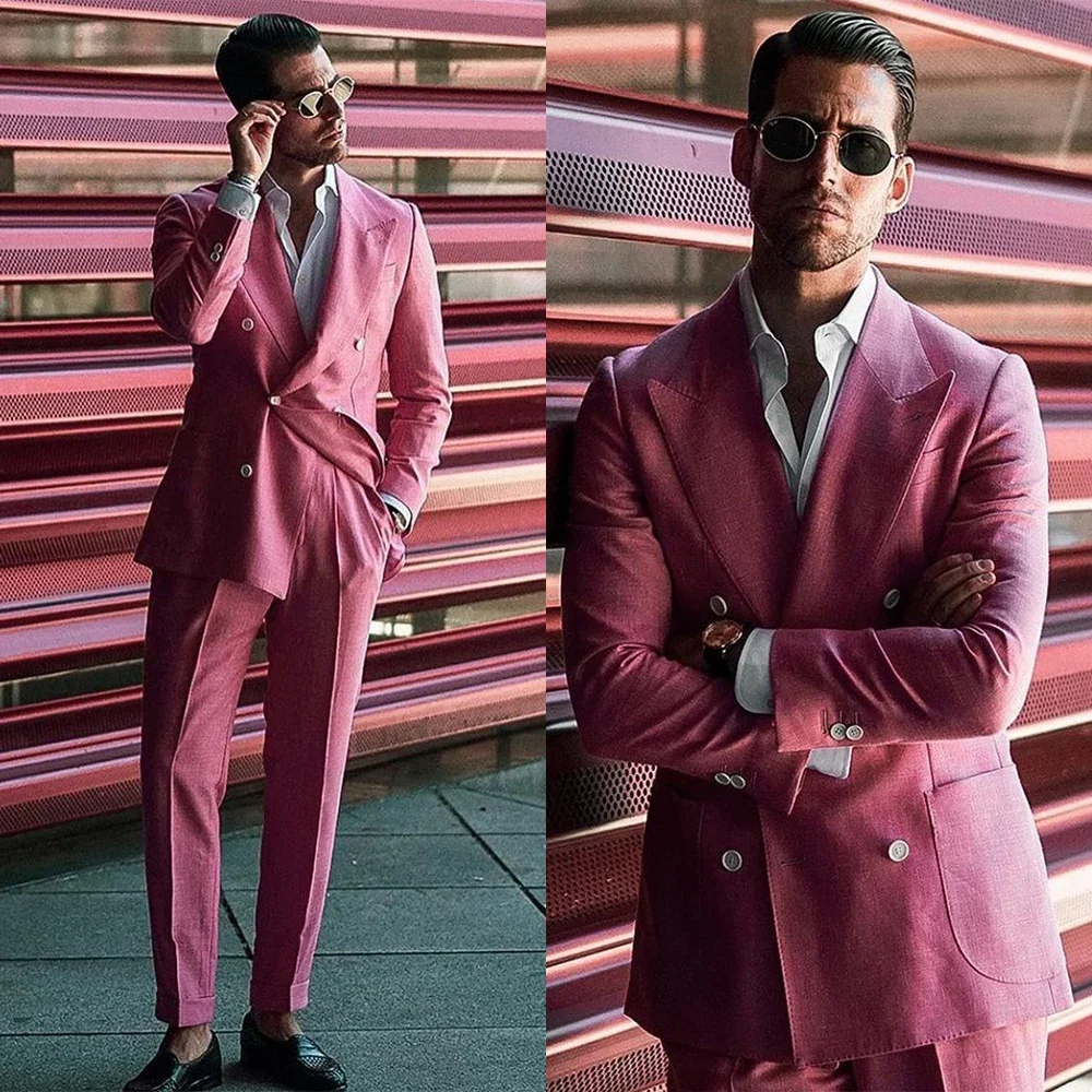 Fashion Pink Men Suits Double Breasted Groom Peaked Lapel Prom Party Two Pieces (Jacket+Pants) Set