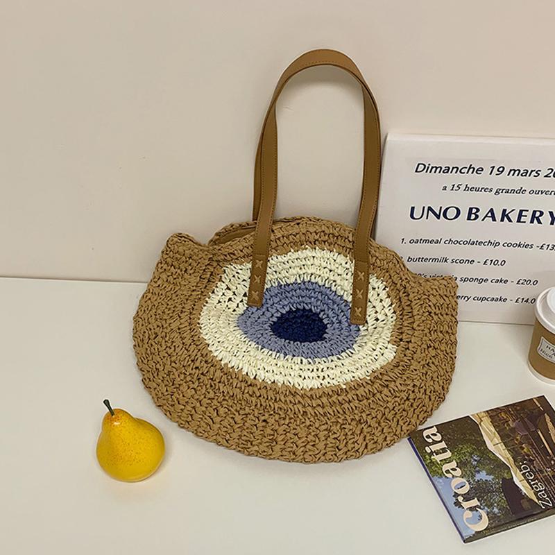 Соломенная сумка женская ручная плетеная сумка круглая форма ротанговая сумка большая вместимость повседневная пляжная сумка через плечо 30x2x43cm коричневый