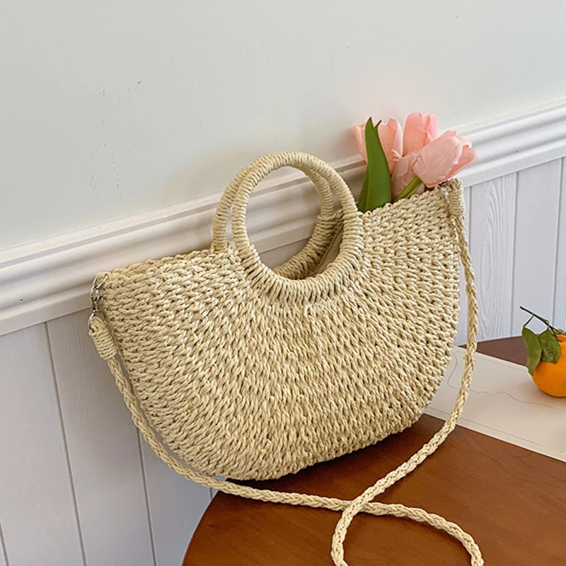 Соломенная сумка, женская сумка ручной работы, лунная форма, кружевная сумка из ротанга с бантом, большая вместительная повседневная пляжная сумка через плечо на шнурке