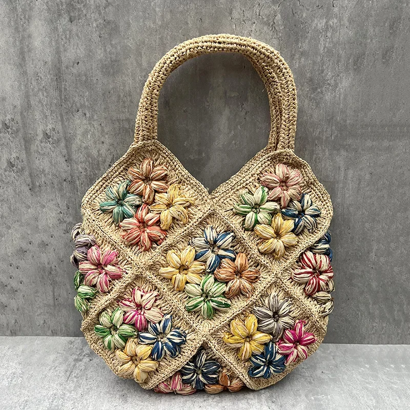 Соломенная сумка ручной работы крючком с цветком, богемные пляжные сумки из рафии для женщин, летняя дорожная тканая сумка на плечо, сумка-шоппер Cue
