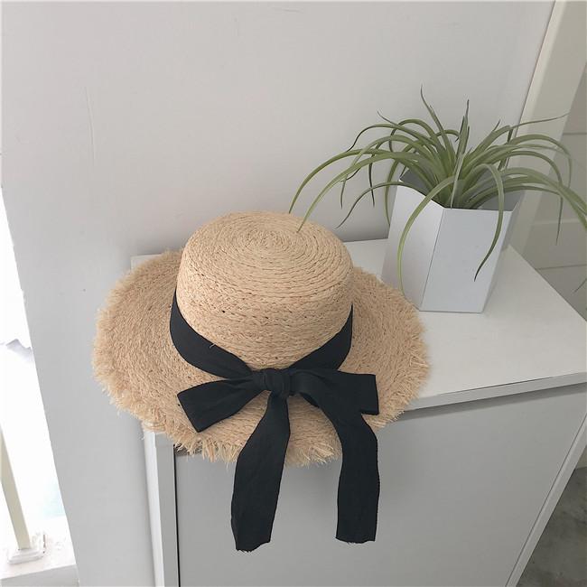 Соломенная шляпа с поломанными краями, с лентой, детская, из рафии, с плоским верхом, свежая, для защиты от солнца на море, защита от солнца, пляжная шляпа M(56-58cm) чёрный