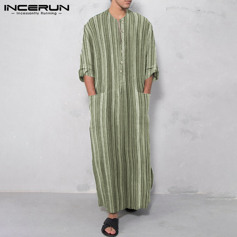 INCERUN Men Muslim Islamic Arabic Kaftan Striped Vintage Button Pockets Long Sleeve Cotton Jubba Thobe Dubai Middle East Abaya