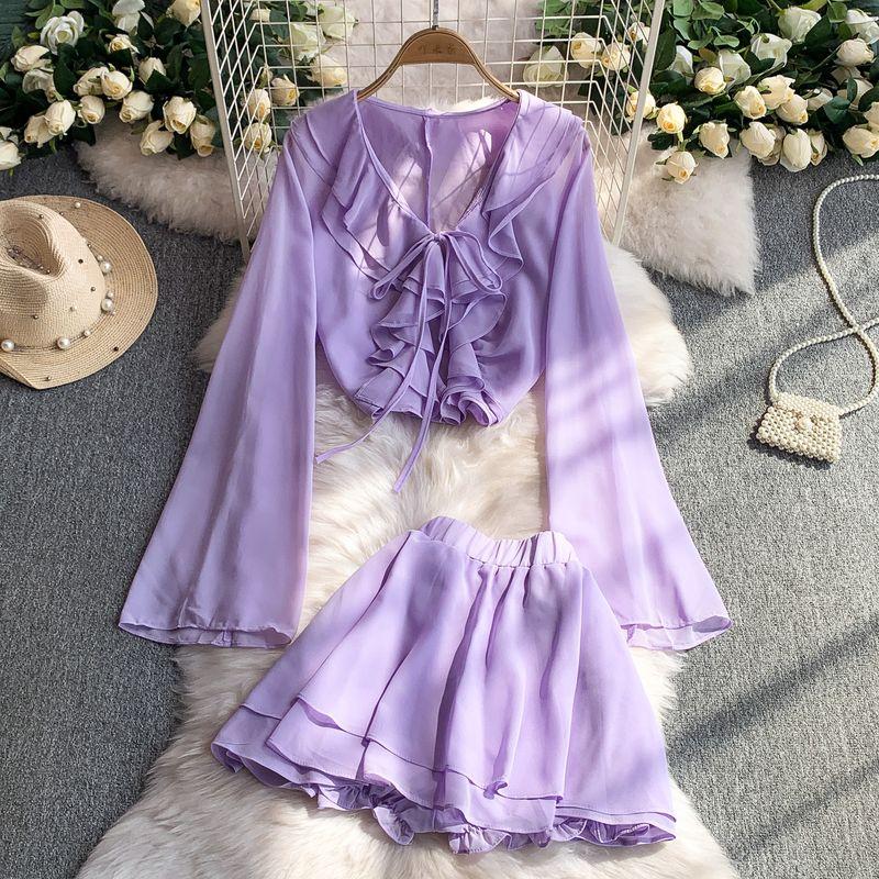 Социалит Омолаживающий Деревянный Ушной V-образный вырез Рукав-колокол Рубашки для защиты от солнца Короткий тюлевый топ на шнуровке + Шорты с высокой талией Комплект платья Violet One size