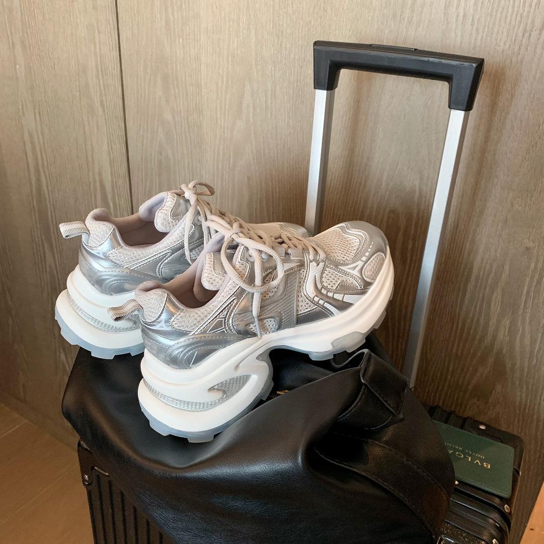 Спортивная обувь Поп-обувь Весенняя женская обувь Модные дышащие двойные сетчатые толстые низкие кроссовки с цветовым сочетанием Удобные классические кроссовки 35 белый