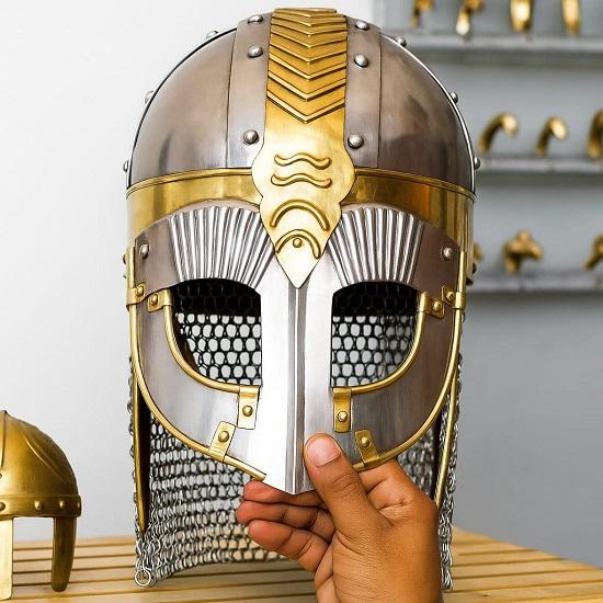 Средневековый шлем викинга: Сделанная вручную стальная латунная норвежская броня с кольчугой