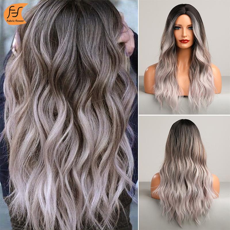 Средний градиент серо-коричневый белое золото мелирование краситель длинные локоны большая волна модный парик из химического волокна парики с полным покрытием головы