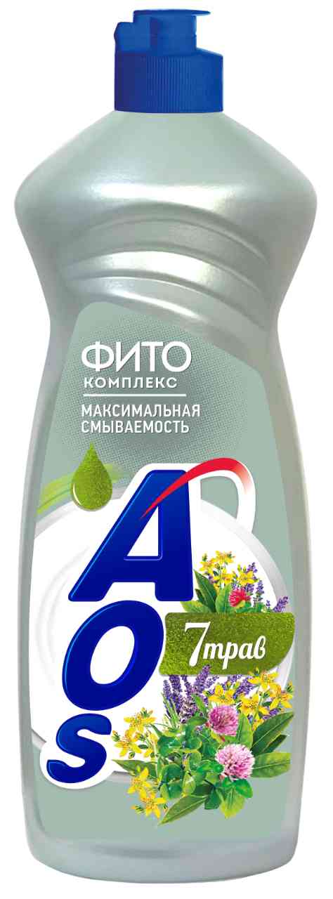 Средство для мытья посуды жидкое "AOS Фитокомплекс 7 трав".Эффективно удаляет жир, отмывая посуду до кристального блеска. Улучшенная формула с фитозащитными свойствами увлажняет и питает кожу, устраняет ощущение стянутости.
