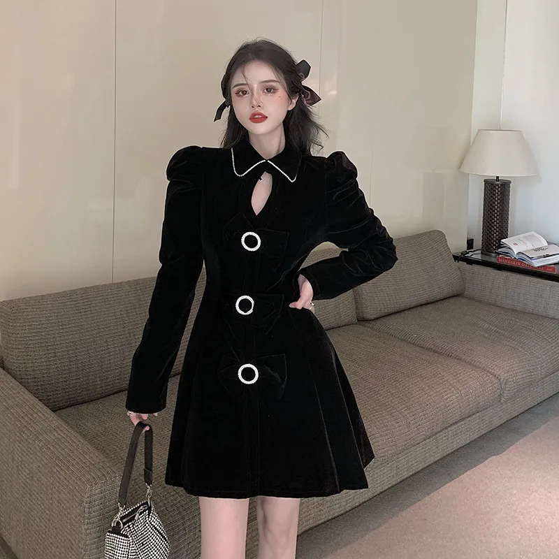 Старое модное маленькое черно-красное платье на осень и зиму, элегантное платье-трапеция с длинным рукавом и бантом, бархатное вечернее платье с вырезами и приталенной талией