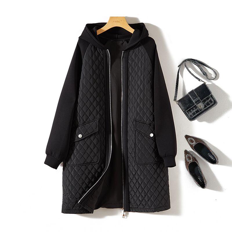 Стеганая средней длины длинная стеганая куртка с капюшоном верхняя одежда женская свободная большого размера прямая на молнии пальто размера кинг-сайз утолщенная хлопковая куртка с наполнителем зимняя Black 2XL