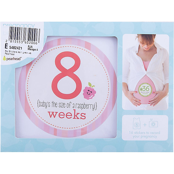 Стикеры Как я рос от американского торгового бренда, который специализируется на создании подарочных наборов для новорожденных и их родителей. Набор включает в себя 16 круглых наклеек с изображенными на них цифрами 8, 12, 16, 20, 24, 28, 30, 32, 34, 36, 38, 40, 2 наклейки с указанием пола и 2 с шутливыми надписями. На каждой наклейке с указанием недели беременности нарисован фрукт или ягода, размерам которого соответствует развивающийся ребенок.