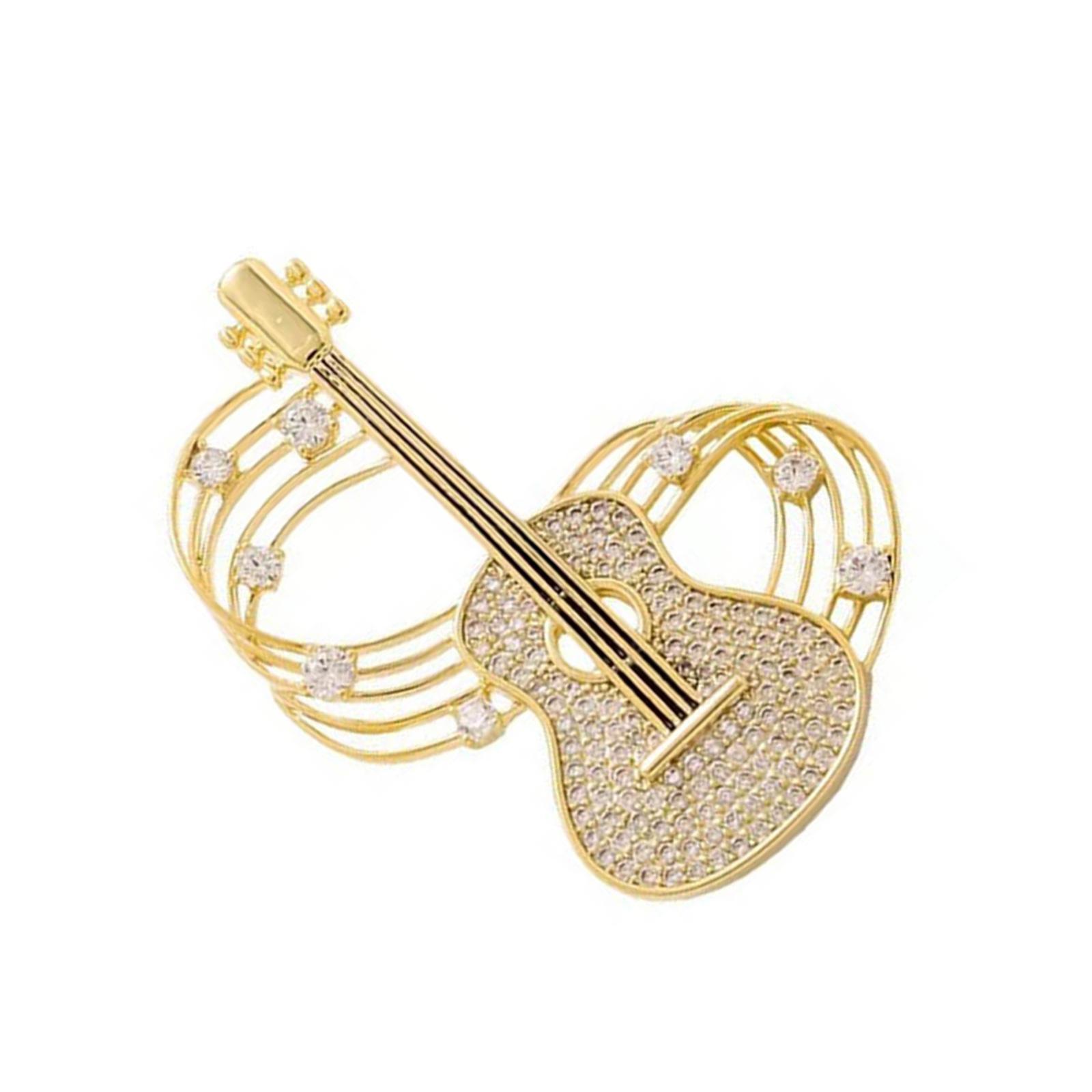 Стильная брошь в виде гитары с нотами, со стразами, из сплава, золотистого тона, булавка, ювелирное украшение для музыкантов, аксессуары для концертов и вечеринок золотой