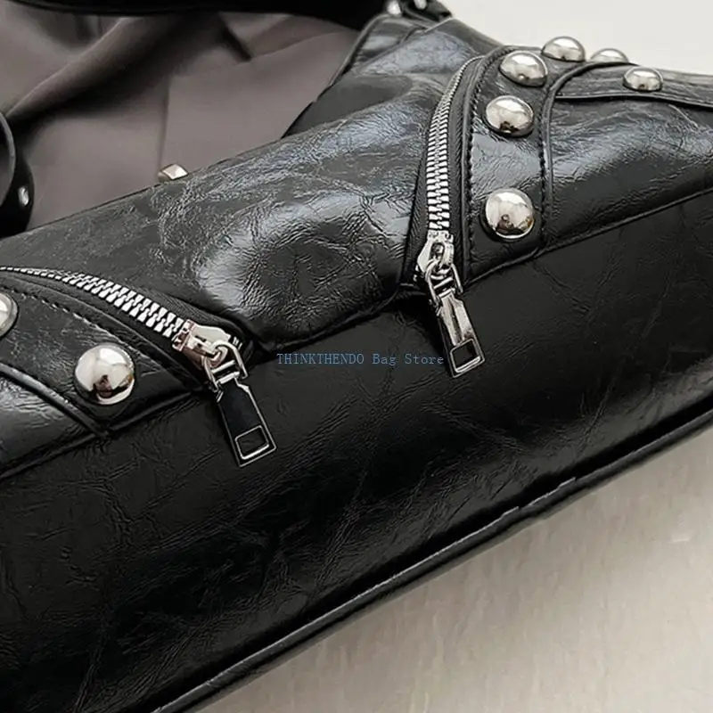 340D PU Leather Pleats Textured Shoulder Bag for Women Punk Rivets Crossbody Underarm Bag Adjustable Strap Zippered Handbag