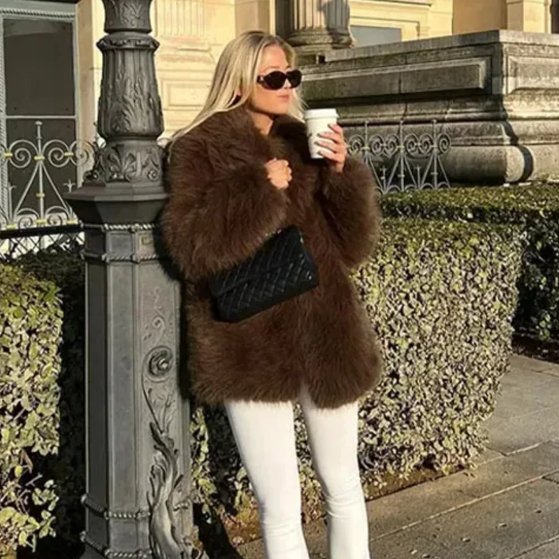 Стильное пальто из искусственного меха в стиле ретро с лацканами и длинными рукавами, толстые теплые пальто, повседневная шикарная изысканная модная классическая женская зимняя верхняя одежда