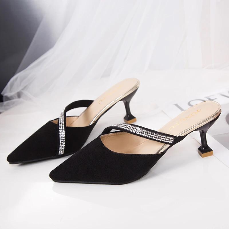 Стильные туфли на каблуке со стразами, остроносые мюли, новая летняя обувь, женские туфли-лодочки с лентами, элегантные слипоны, милые туфли для вечеринки 40 чёрный