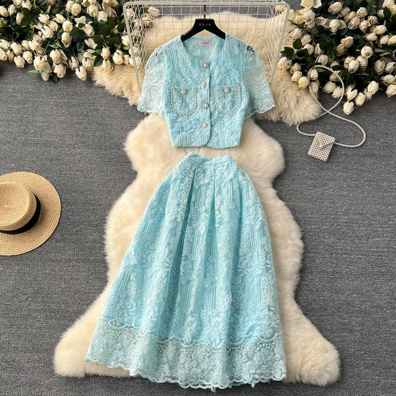 Стиль светской львицы Вязаные крючком рукава-буфы Высокая талия Приталенное кружево Blue M