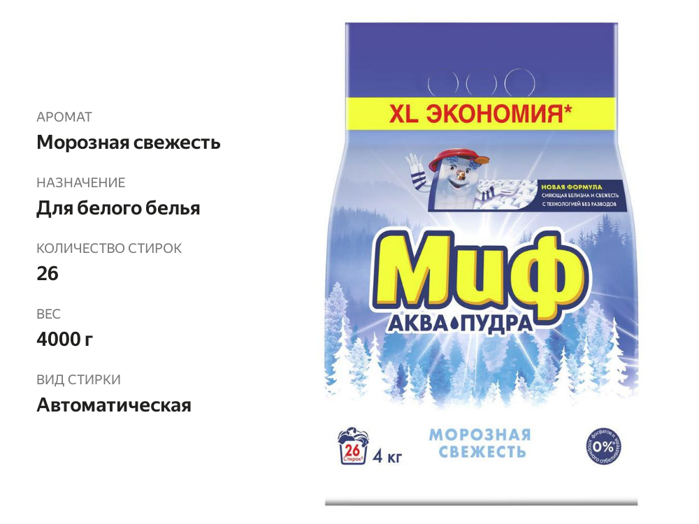 Стиральный порошок для белого белья Миф Морозная свежесть 3 в 1 автомат 4000 г