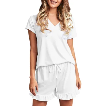 Women's Sleepwear Summer Female Casual Solid Color Soft V-Neck Short Sleeve Ruffle Lace Tops Plus Shorts Set