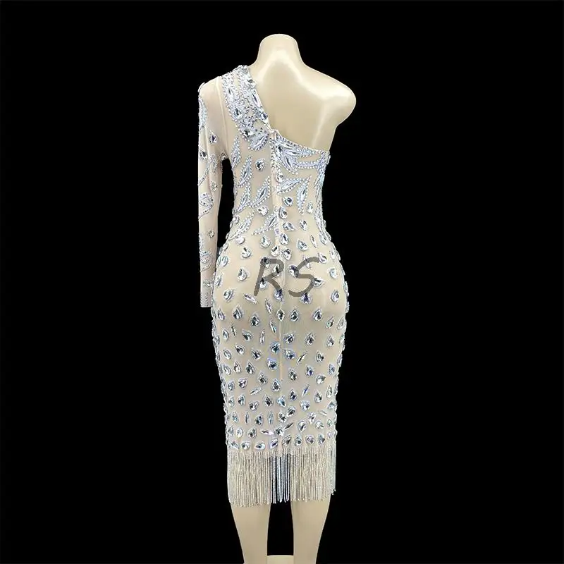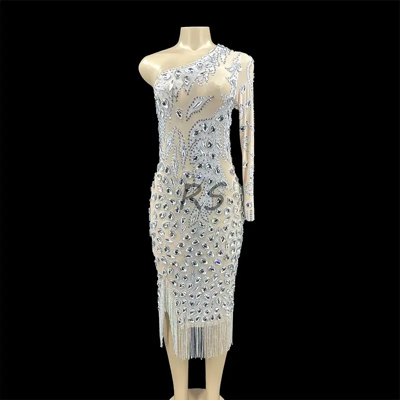 Стразы, женское сексуальное платье на одно плечо, блестящее Серебряное платье с цепочкой, прозрачный вечерний костюм на день рождения