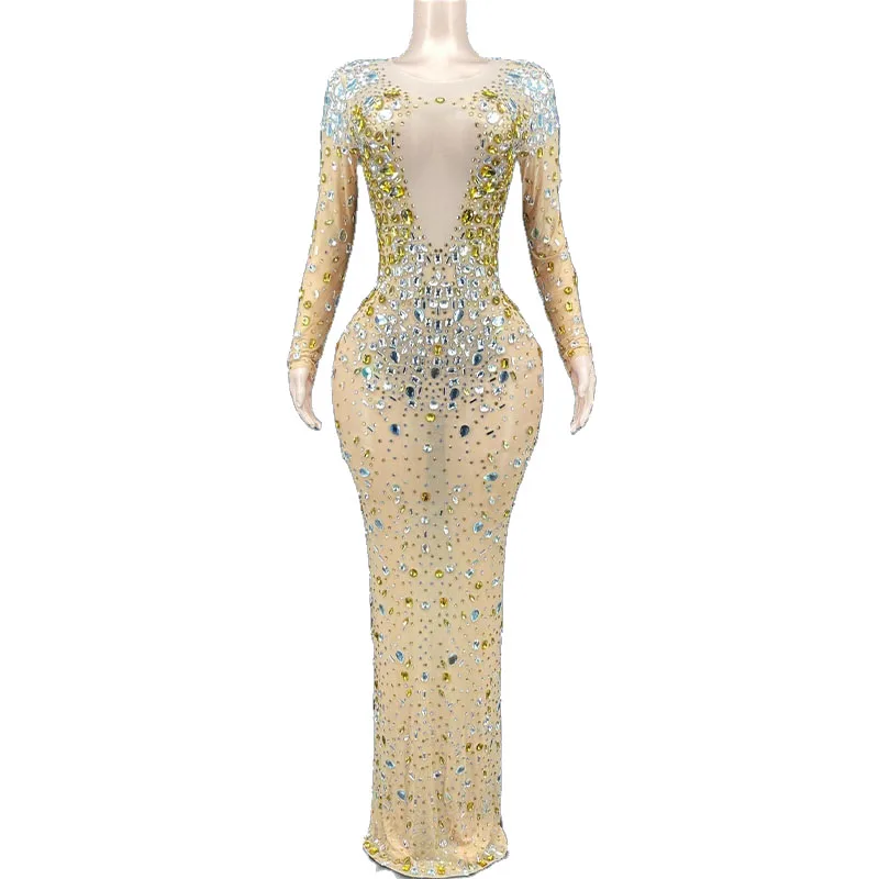 Стразы сексуальное Золотое Прозрачное платье с большими кристаллами вечерний костюм на день рождения роскошный костюм танцор одежда для вечевечерние НКИ и клуба
