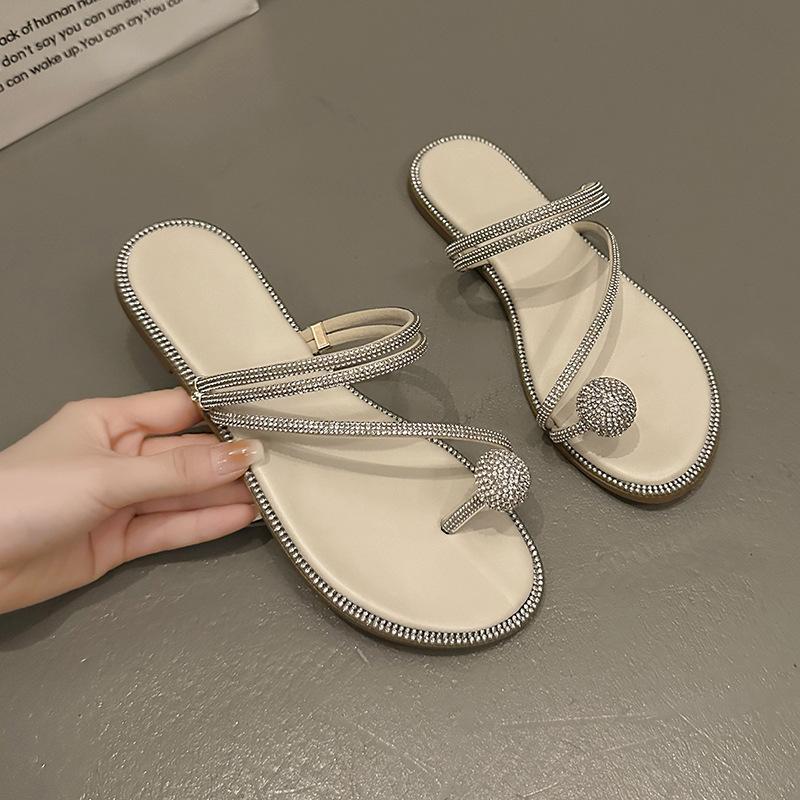 Стразы тонкий ремешок плоская подошва набор пальцев шлепанцы для женской летней носки новые модные универсальные юбка красивые крутые шлепанцы 40
