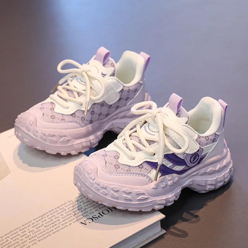 Студенческие кроссовки Толстая мягкая подошва Детская спортивная обувь Сетчатые дышащие 2025 Новая мода Кроссовки для мальчиков и девочек На липучке 26 фиолетовый