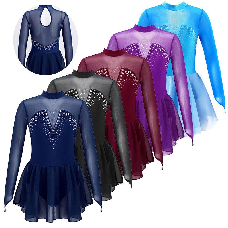 Сукня для фігурного катання, сітчаста сукня з довгими рукавами, для дівчаток, гімнастики, танцювальної підготовки 5-6 Years темно-синього кольору
