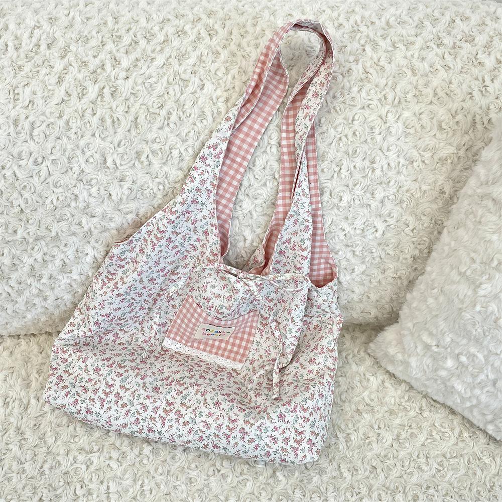 Сумка большой вместимости Весенне-летняя студенческая новая тканевая сумка с цветочным принтом Холщовая сумка Модель с цветной вставкой на одно плечо розовый
