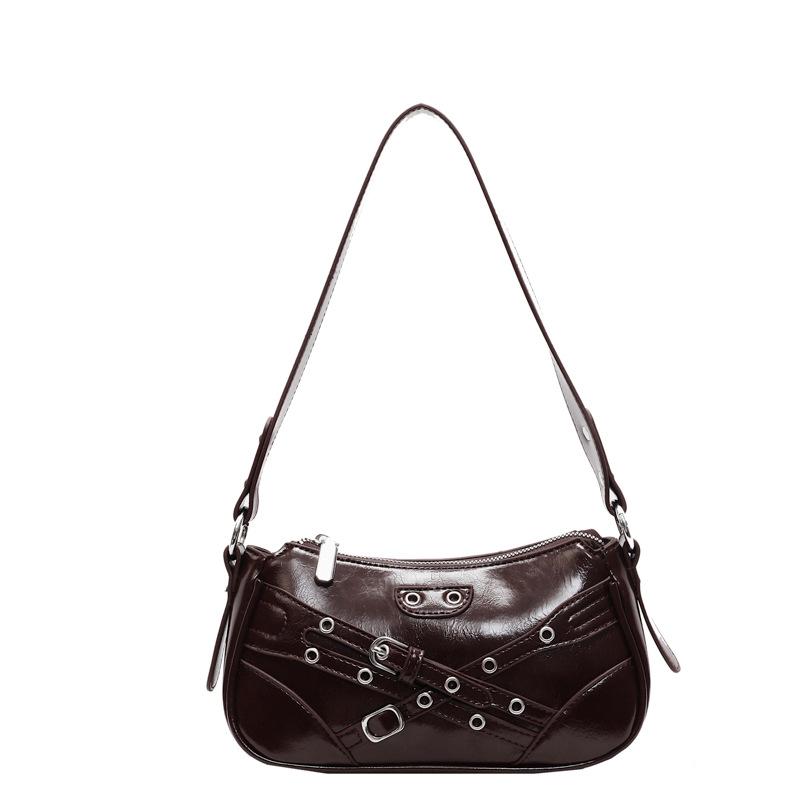 Сумка женская портативная на весну и лето 2025 оптом, с заклепками, в стиле ретро, сумка-локомотив, ремешок с замком, на плечо, сумка-мессенджер темно-коричневого