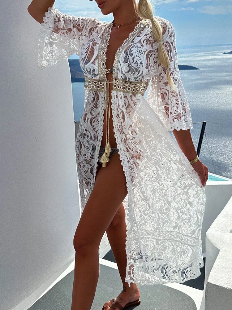 Женское Прозрачное платье-кардиган с рукавами-колоколами, свободное однотонное платье в пляжном стиле с V-образным вырезом, лето 2023
