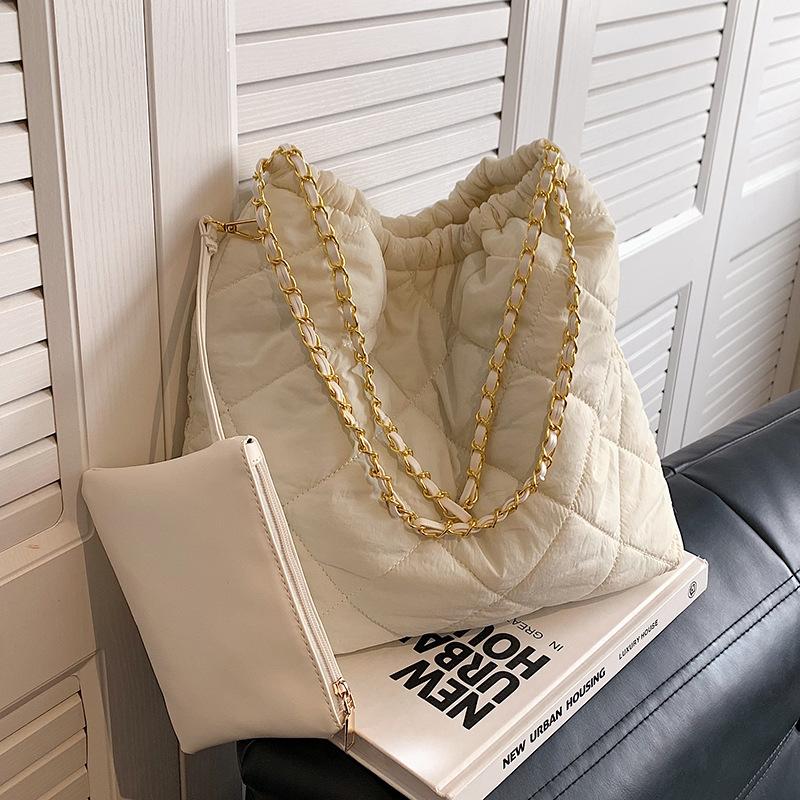 Сумка из ткани Оксфорд женская большой вместимости новая осенне-зимняя универсальная на плечо премиальная сумка-ведро с ромбовидной цепочкой белый