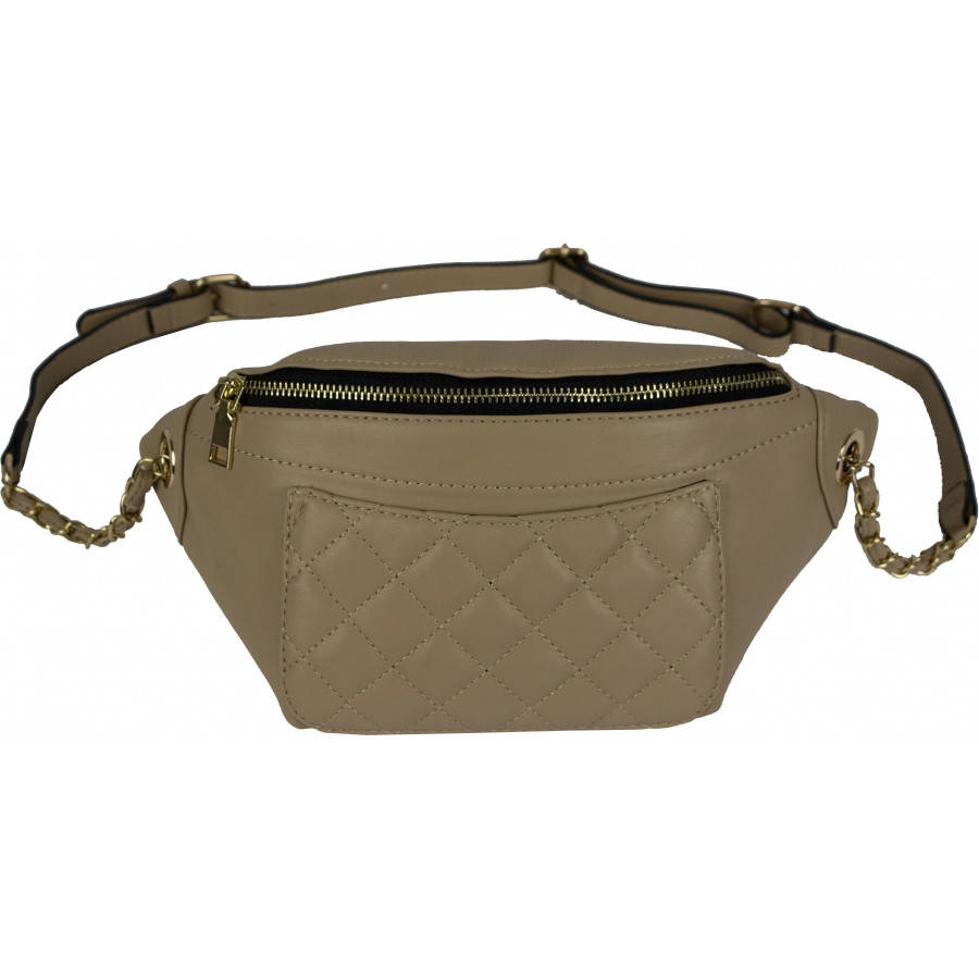 Стильная, удобная и вместительная поясная сумка. Её можно носить на поясе, на груди, через плечо и с лёгкостью разместить необходимые в повседневной жизни мелочи. Материал - кожзаменитель. Удобный, регулируемый поясной ремень из кожзаменителя на цепочках с максимальным обхватом 136 см., ширина ремня 2 см. Поясной ремень фиксируется и регулируется при помощи двух металлических пряжек. На лицевой стороне расположен накладной карман с диагональной прострочкой. Внутри - прочная тканевая подкладка коричневого цвета, одно большое отделение, карман для документов.