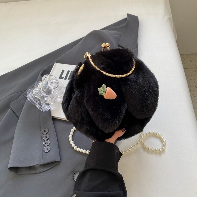 Сумка с плюшевым кроликом женская корейская версия милая портативная пушистая сумка 2024 осень-зима новая сумка с клипсой на кроличьи ушки чёрный