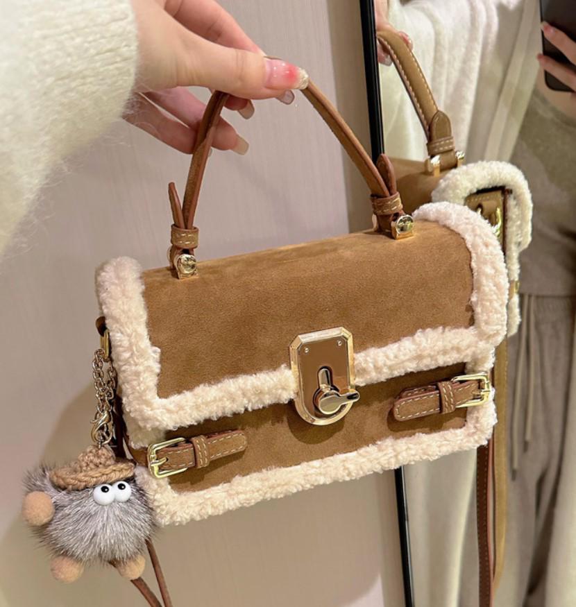 Сумка через плечо из замши из овечьей шерсти 2024 года - высококачественная маленькая квадратная сумка-мессенджер коричневый