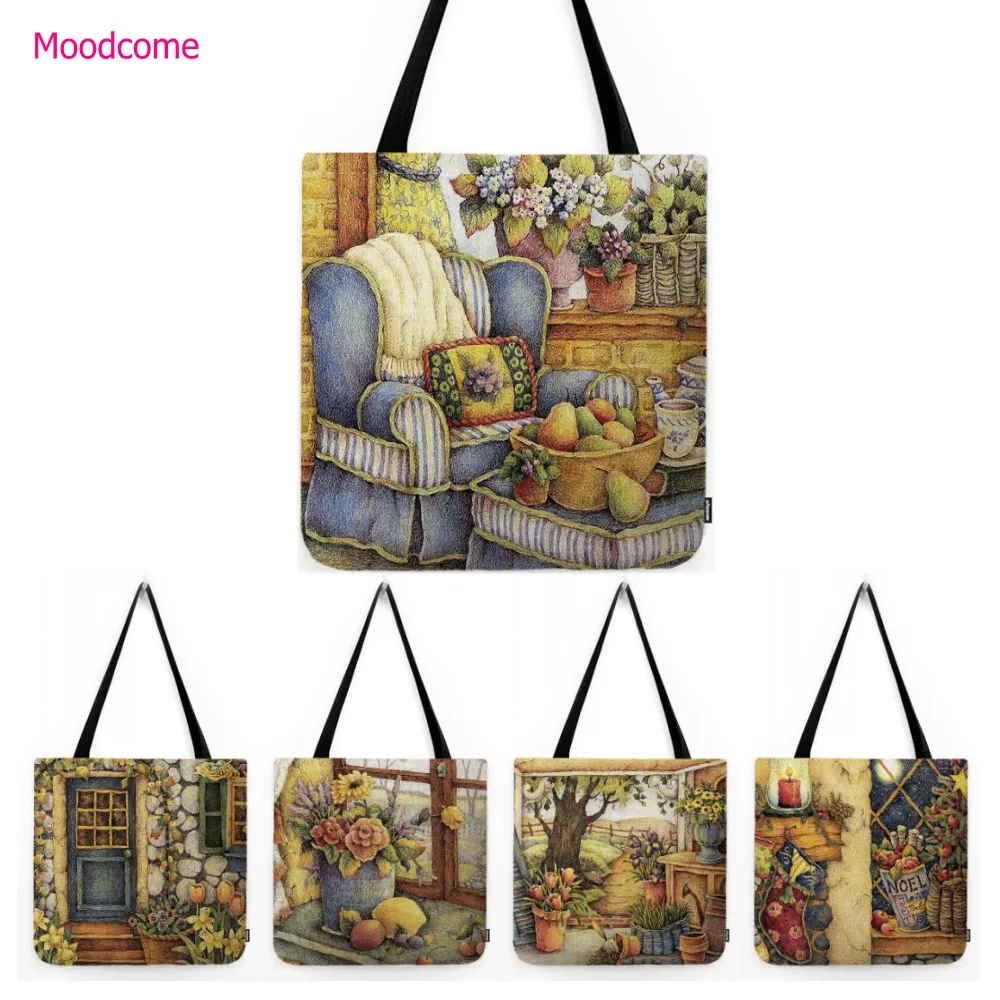 Сумка-шоппер на плечо с рисунком масляной живописи, Большая водонепроницаемая хлопково-Льняная сумочка-тоут в американском пасторальном с...