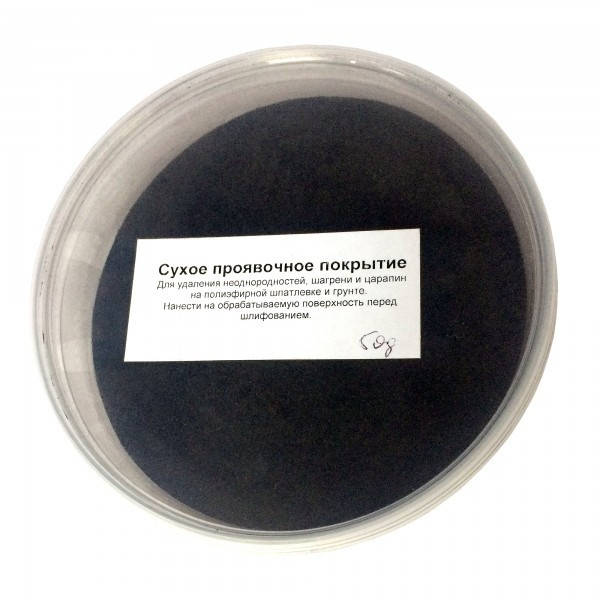 Используется для выявления всех упущенных при шлифовки дефектов и поможет правильно зашпатлевать поверхность. Вес нетто : 50 г. Проявочный порошок наносится на шлифуемую поверхность. После нанесения становятся явно видны все огрехи, допущенные при нанесении и шлифовании шпатлевки. Рекомендуется использовать проявку на всех этапах шлифовальных работ и, особенно, для шлифования после грунтования, перед покраской.После использования и перед нанесением нового слоя шпатлевки стирать проявку с поверхности не нужно. Достаточно просто обдуть поверхность воздухом из компрессора.