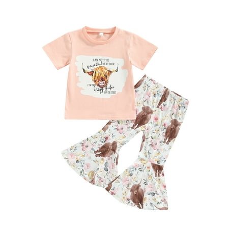 Canrulo Summer Lovely Kids Baby Girls Clothes 2pcs Cow Printed Short Sleeve T Shirts+Floral Flare Pants Sets Pink 4-5 Years