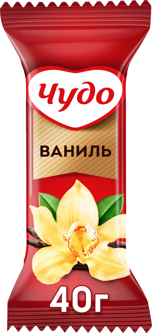 Срок годности в днях: 30Состав: Творожная основа (творог, масло сливочное, сахар, загуститель – E1414, стабилизатор - альгинат натрия, ароматизатор «Ваниль», консервант-сорбат калия), глазурь (сахар, какао-порошок, заменитель масла какао, заменитель молочного жира (растительные масла, эмульгатор моно- и диглицериды жирных кислот, антиокислитель – E306, краситель – каротины), эмульгатор 0 соевый лецитин, ароматизатор)Пищевая ценность: Калорийность: 400Белки: 9Жиры: 26Углеводы: 33Страна изготовления: РоссияПроизводитель: Чудо