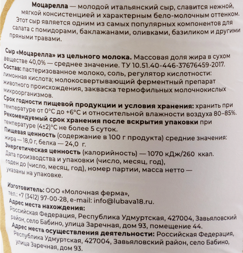 Сыр ЛЮБИМЫЙ СЫРОВАР Моцарелла из цельного молока ф/у без змж вес до 300г