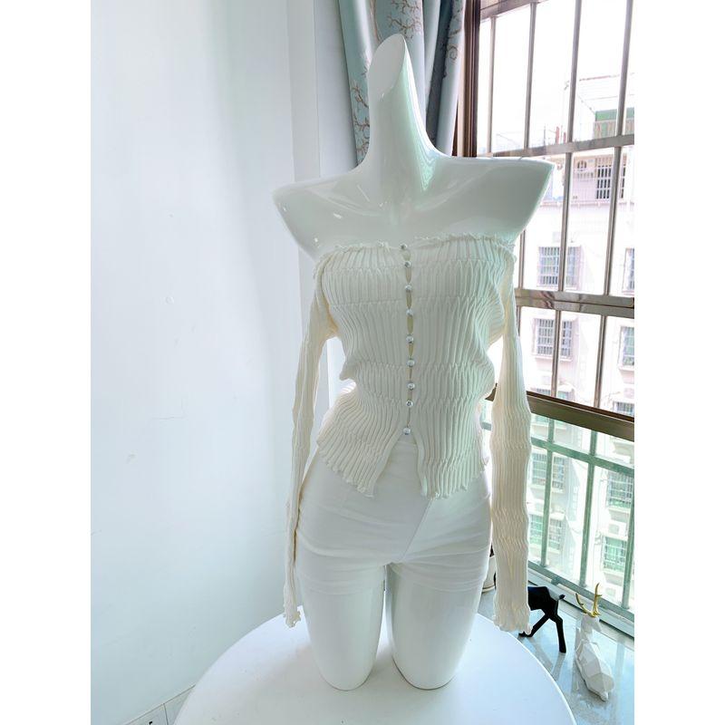 Сюй И Ослепительная Чжао Лусы Тот же стиль с открытыми плечами Тонкий трикотаж Жемчужная пряжка С открытыми плечами Белый Приталенный Топ Женский Весна White S