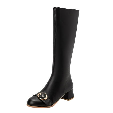 Fsqjgq Knee High Lace Up Boots for Women Flat Fashion Women s Shoes British Style Leather Solid Side Zipper Belt Decorative Button Knee High Boots Knee High Boots for Women Wedge Black 38