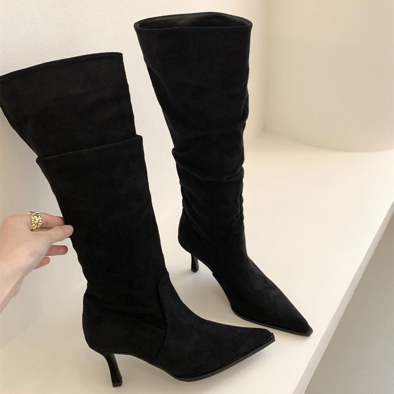 Танцуем Зимний Уличный Стиль Остроносые Сапоги до Колена Женские Туфли на Высоком Каблуке Женские Длинные Ботильоны Zapatos De Mujer 39 чёрный