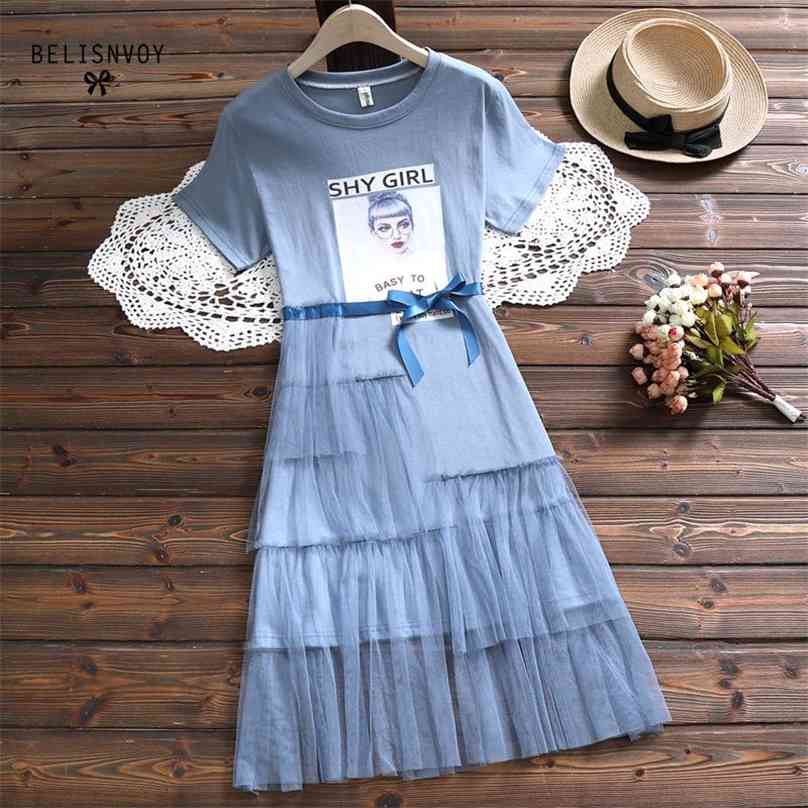 Fashion Women Letter Lips Printed T-Shirt Dress Summer Mesh Patchwork Short Sleeve Loose Preppy Style Sweet es 210520, Pink